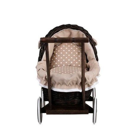 Dark Painted Wicker Doll Pram – Beige Bedding